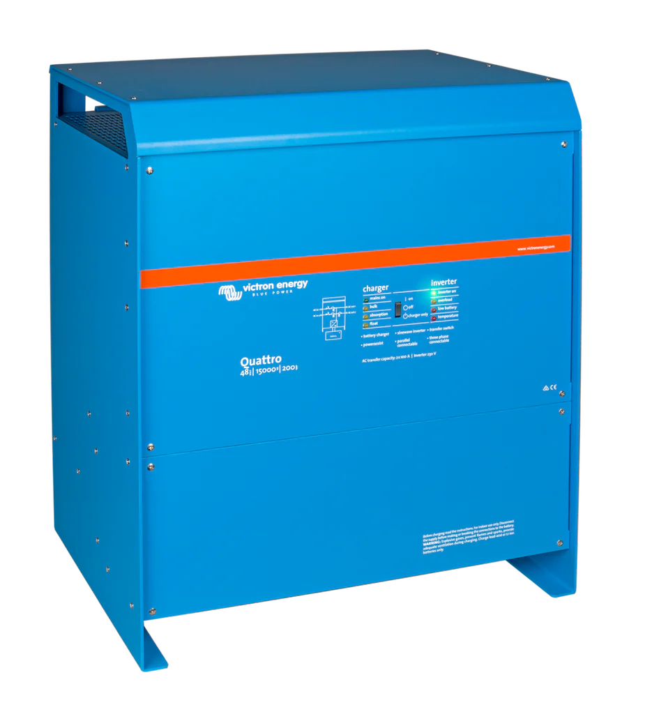 Similar to the MultiPlus, the Quattro is also a combined inverter and charger. Additionally it can accept two AC inputs and automatically connect to the active source. Its many features include a true sine wave inverter, adaptive charging, hybrid PowerAssist technology plus multiple system integration features such as three or split phase operation and parallel operation.